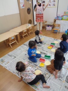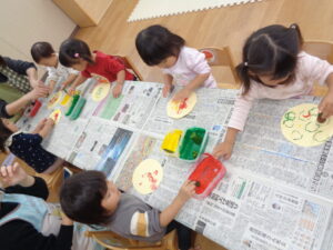 今日はみかん組さん、ふたば組さんで野菜スタンプをしました!
