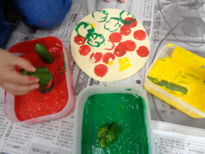 赤・緑・黄の三つの色を使ってピザをイメージした作品を作ります💓