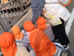 発表会練習の後は周辺散歩にでかけました。出かける前にワンちゃんはいるかなぁ~?とお話ししたら、「ワンちゃんねんね」と、ねんねのポーズをしてくれたお友だちもいて、みんなでワクワクしながらお散歩へしゅっぱ~つ!お散歩へ行く前のお靴を履く動作もササっと履いて準備完了。