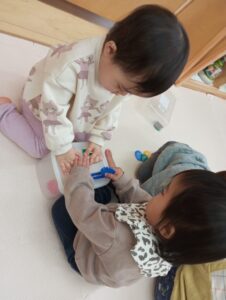 お散歩から帰ってきた後は、室内遊びをしました。こちらは、みかん組さんの微細玩具なのですが、少しずつ難しい玩具にも挑戦し器用に指先を使って遊べています。お友だちと一緒に仲良く遊ぶ姿が見られ、微笑ましいですね。