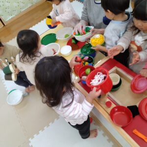 おままごとをしています。皆さんのお母さまたちを真似てお料理中です。時に取り合いになりそうなシーンもありますが、「貸して」「いいよ」のやり取りが聞こえてきます。言葉というツールを使って、自分の気持ちに折り合いをつけてお友だちと関わっていく力がついてきましたね。