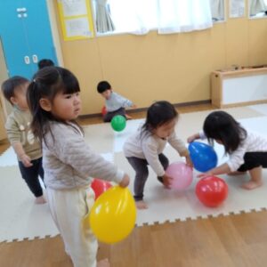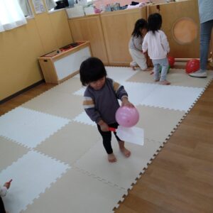 おままごとの後は風船遊びをしました。ポ~ンと投げたりうちわでパタパタしてみたり、楽しいね~(^_-)-☆