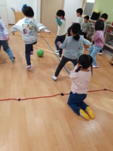 当てられた子はコート外へ出たくなくて、自分の中で納得がいくまで時間がかかってしまう時もありますが、自分で気持ちを切り替えてまた遊びに参加をして頑張っている姿も見られます。