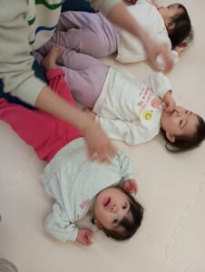 「きゅうりしようね♪」と保育士がお話しすると、さっそく自分から仰向けになる子どもたち^^