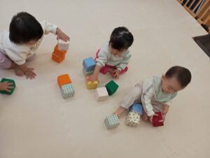 お部屋では、積み木を保育士が作っていたものを壊すことを楽しんでいたももくみさんですが、