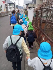 今日のふたば組さんはにじ組さんと一緒に公園に遊びに行きました。大きいお兄さん、お姉さんと一緒に手を繋ぎ歩いて行きます。にじ組のおともだちは少しゆっくりのペースで歩き、危ないところや歩きにくいところなどふたばさんのことをしっかりリードして歩いてくれました。