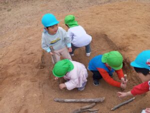 「ここをもうちょっとほってー」木の棒を使って一生懸命に土を掘っていました。さて、何ができるのでしょうか。