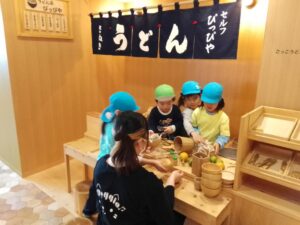 うどん屋さんは大人気!で、うどんを作りたいお友だちがたくさんいて、大盛りうどんが出てきて思わずお客さんもびっくりして笑っていましたよ😊
