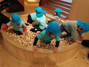 たくさん木のボールが入っているボールプールも大人気で、素足で中に入って感触を楽しんだり、ボールの木の香りを確かめたり、握り心地を面白がったりしながら思い思いに楽しみながら遊ぶ姿が見られました😊
