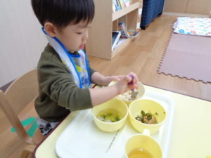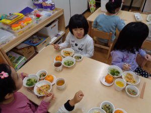 ふたばぐみさん、お友だちとお話しながら給食の時間を楽しんで食べています😊
