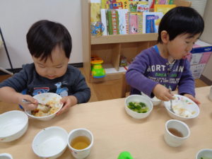 にじぐみさんはお当番さんが献立を読んで、みんなでいただきます😊