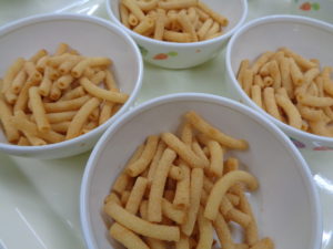 ゆでたマカロニに、きな粉、砂糖、塩をまぜて、まぶします。