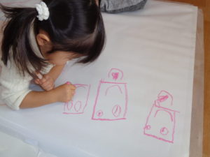 お部屋では、大きなキャンバスに絵を描きました。