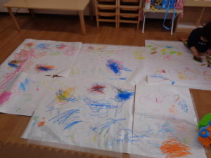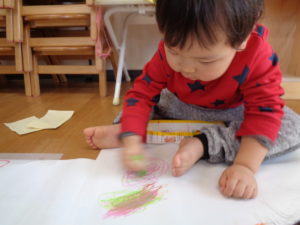 子どもたちは、画用紙に色や形がついていく様子を楽しんでいます(^^♪