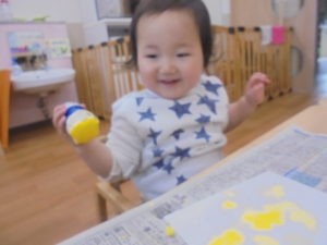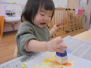 ももぐみさんは、スタンプ遊びです。たんぽを使って、好きなところにポンポンポン。