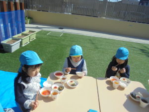 にじ組の子の「おそとでたべた~い!」という提案から、今日は園庭でご飯を食べることにしました!