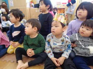 たくさんのお友だちの前に出るのは少し緊張したけど、ひとりで前に座ることができました✨プレゼントをもらい、ハッピーバースデーの歌をうたいお祝いしました😊