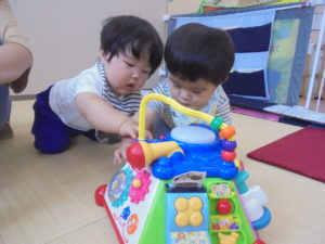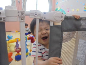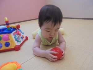 ももぐみさんは、先生に見守られながら、ハイハイでボールを追いかけたり、ポットン落としをしたり、日に日にできることも笑顔も増えています。