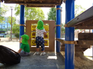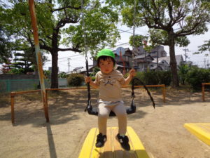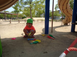 ふたば組さんは公園に行って、ブランコや砂場で、思い思いに体を動かして遊びました。