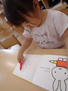 お部屋ではなぐり描きやチャックの開閉など、手指を使って遊びました。