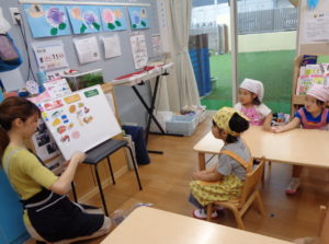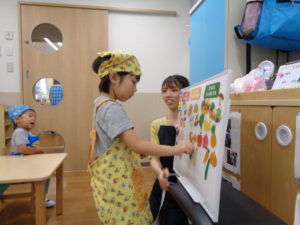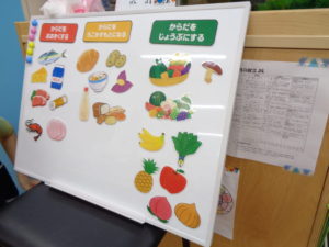 まず、給食の先生に、食べ物は、3つのグループに分かれていることを教えてもらいました。