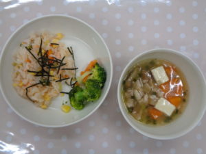 鮭雑炊・ブロッコリーの煮物・豆腐のくず煮
