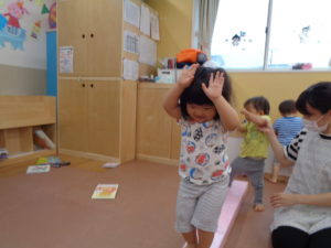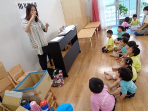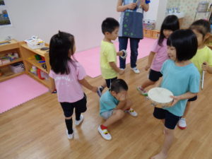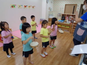 他にも楽器あそびや、4.5歳児さんはかごめゲームをしました。かごめゲームでは後ろのお友だちを当てたり、楽器を当てたり、とても楽しんでいました♪