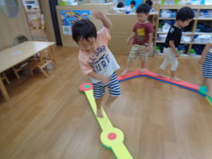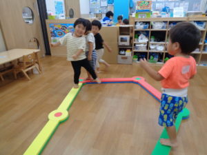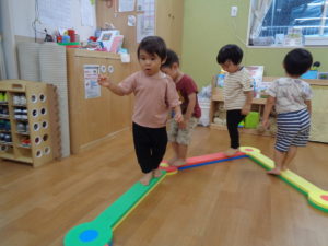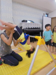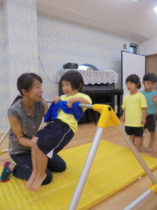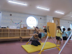 体操では鉄棒や平均台、前転、三点倒立などをしました。週を重ねるごとにできることが増えていき、「今日は〇〇ができたよ!」と嬉しそうに報告してくれます(^^)