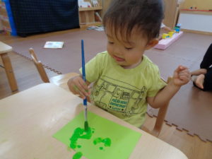 筆に絵の具を付けて、ちょんちょんちょん、すい~すい、真剣に筆をはしらせています!