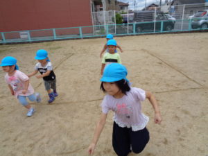 にじ組さんは合図に合わせて「しかく」「まる」「さんかく」の場所に素早く集まるルールのある遊びを楽しみました👯