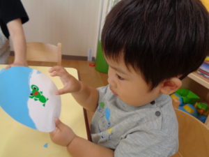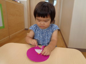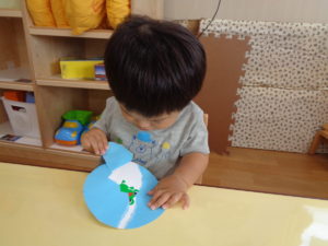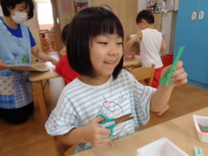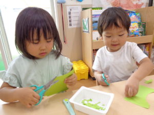 にじ組さんはハサミでチョキチョキ、毛糸は難しそうだけれど、一生懸命やってみたよ