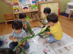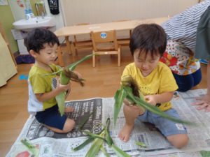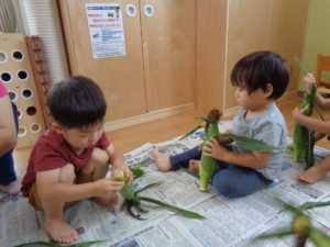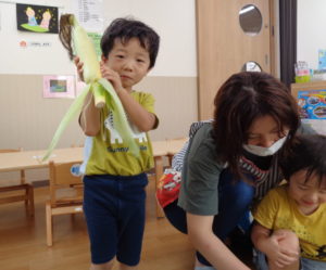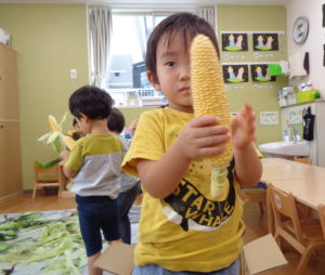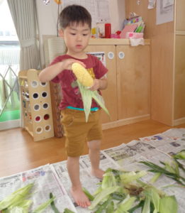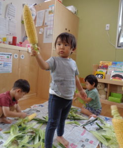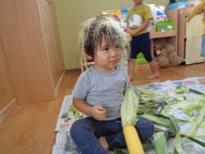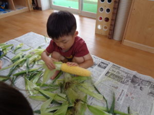 夏のお野菜のトウモロコシの皮むきを頑張ってくれました