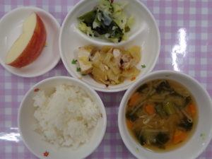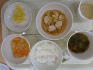 ごはん(五分がゆ)、鶏すきやき風煮込み、キャベツの酢の物、みそ汁(食べて菜入り)、りんご