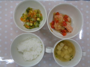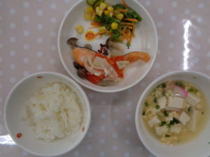 ご飯、さけのレモン蒸し、たまごスープ、レタスサラダ