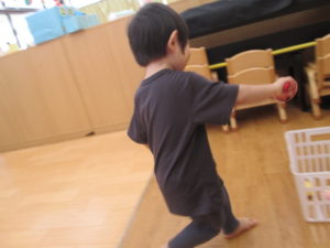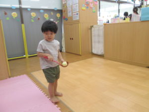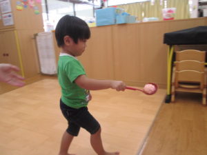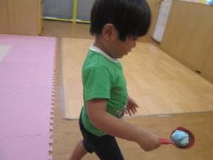 今日は、お玉を使ってボール運びをしました。