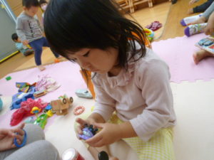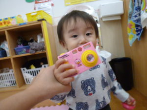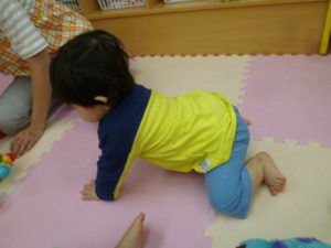 0歳児の子がハイハイの体勢になって頑張っていました。