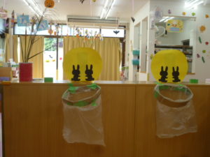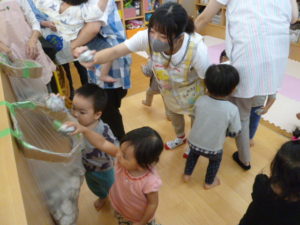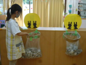 話の後は丸めた新聞紙を団子に見立て、団子入れゲームをしました。