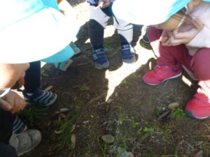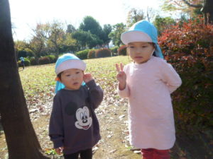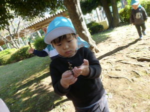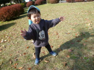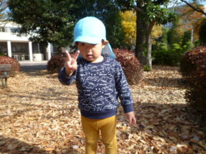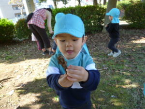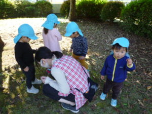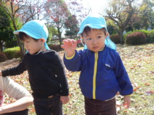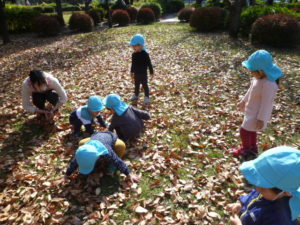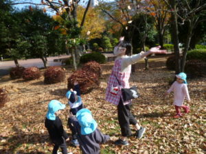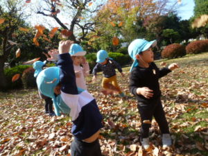 赤い実やどんぐりを拾ったり、落ち葉のシャワーで遊んだり、楽しく過ごしました(^^♪