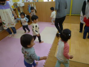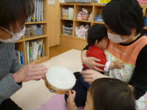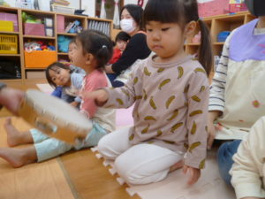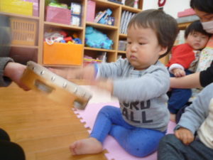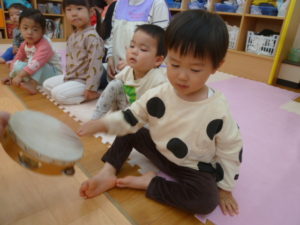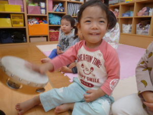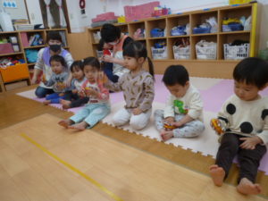 今日はリトミックがありました。楽器を手に、歌や音楽に合わせて鳴らします♪