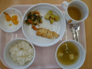 今日の給食は、【ごはん、カレイの照り焼き、小松菜の煮浸し、さつま芋の甘煮、みそ汁(豆腐、わかめ)、オレンジ】でした。