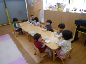 朝おやつを食べて力をつけます。