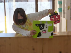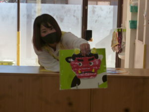 今日はお面をだれがつけているのか当てる出し物をしました。