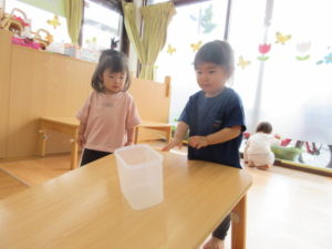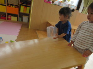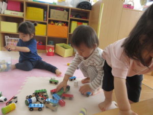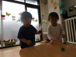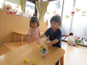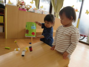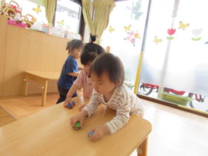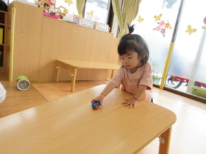 ひまわり組さんは、テーブルの坂道で、おもちゃの車を走らせたり、丸いものを転がして遊びました🚙