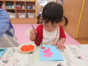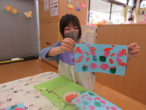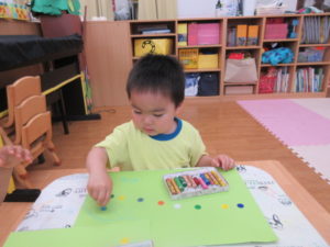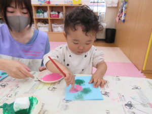 半分に折った画用紙の片面に、筆やスポンジを使って、絵の具をチョンチョンとつけていきます🖌