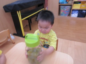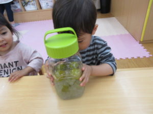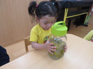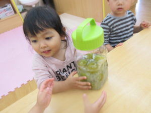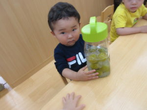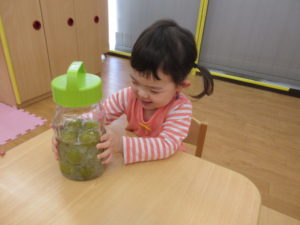 出かける前に昨日ビン詰めをした梅ジュースのビンを、交代で「おいしくなーれ♪」とフリフリしました。