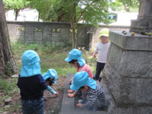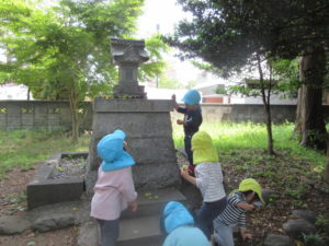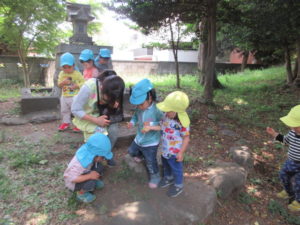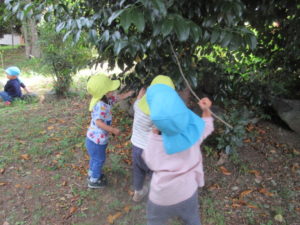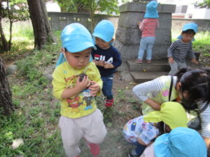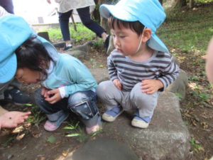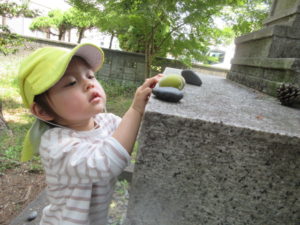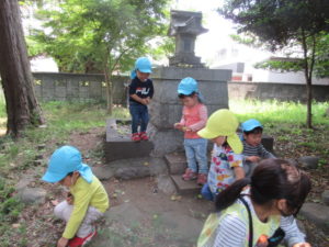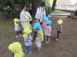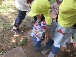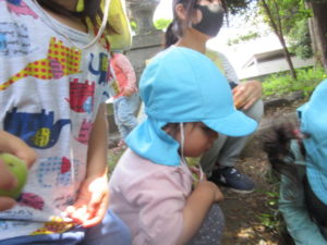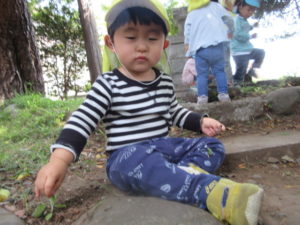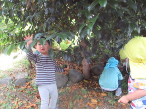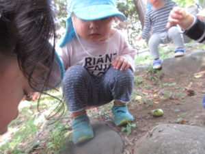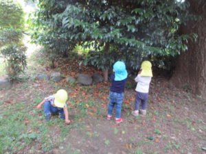 今日は稲荷神社へ行き、木の実をや石を拾ったり、木の下を散策したりしました。