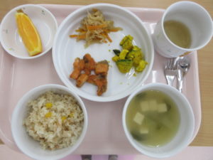 今日の給食は、【ツナコーンごはん、鮭の米粉焼き、切り干し大根の旨煮、かぼちゃのチーズサラダ、みそ汁(豆腐、チンゲン菜)、オレンジ】でした。
