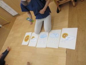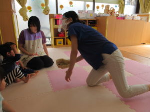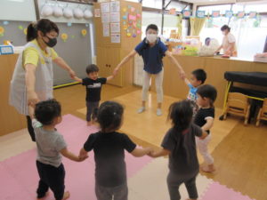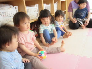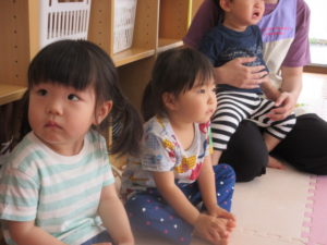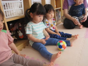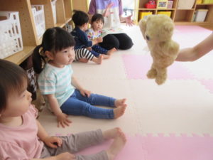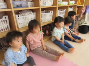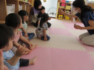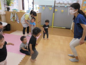 今日は英語の日、ひさしぶりで少し緊張している子もいましたが歌ったり跳ねたり、楽しく参加できました♪