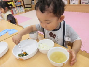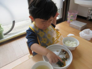 納豆和えは人気でしたが、中には苦手な子もいました。苦手だけれど、工夫をしてご飯と交互に食べ、最後にはお皿ピカピカ、全部食べることが出来ました。