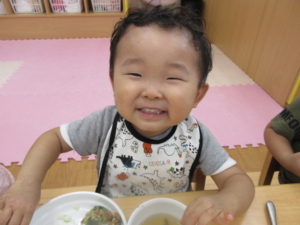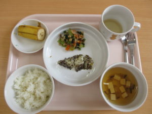 今日の給食は、【ごはん、カレイのしそ風味オーブン焼き(離乳後期食はカレイの煮つけ)、小松菜とえのきの納豆和え、すまし汁(しいたけ、豆腐)、バナナ】でした。